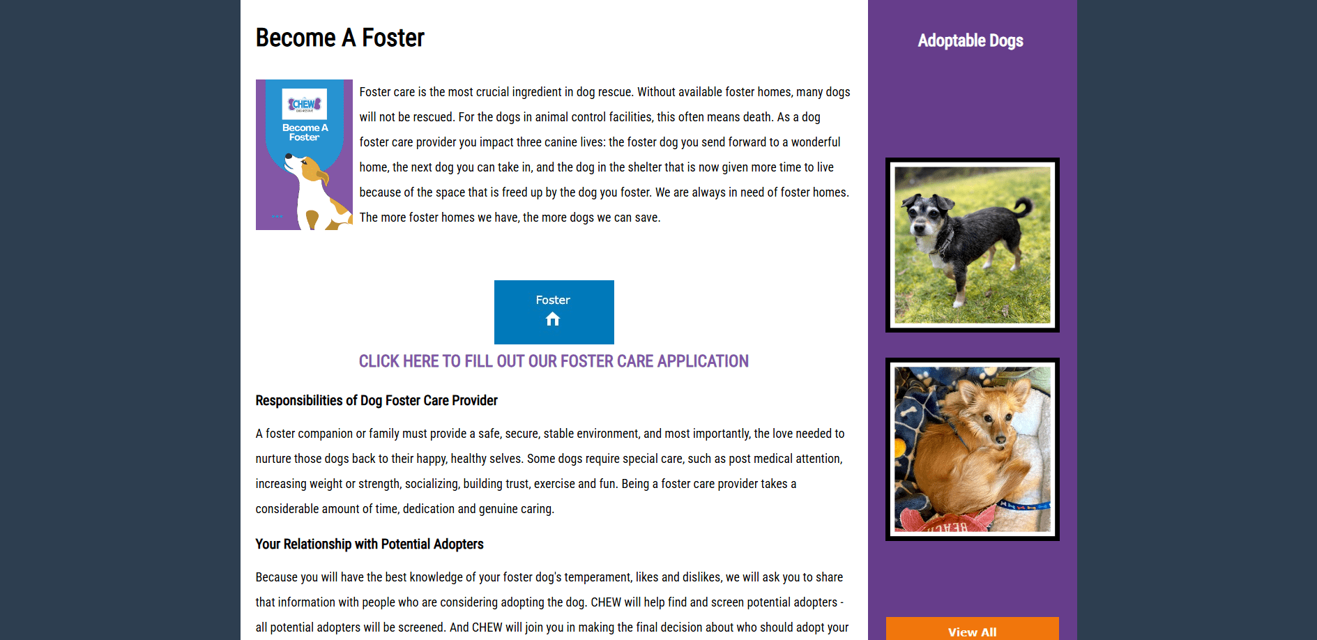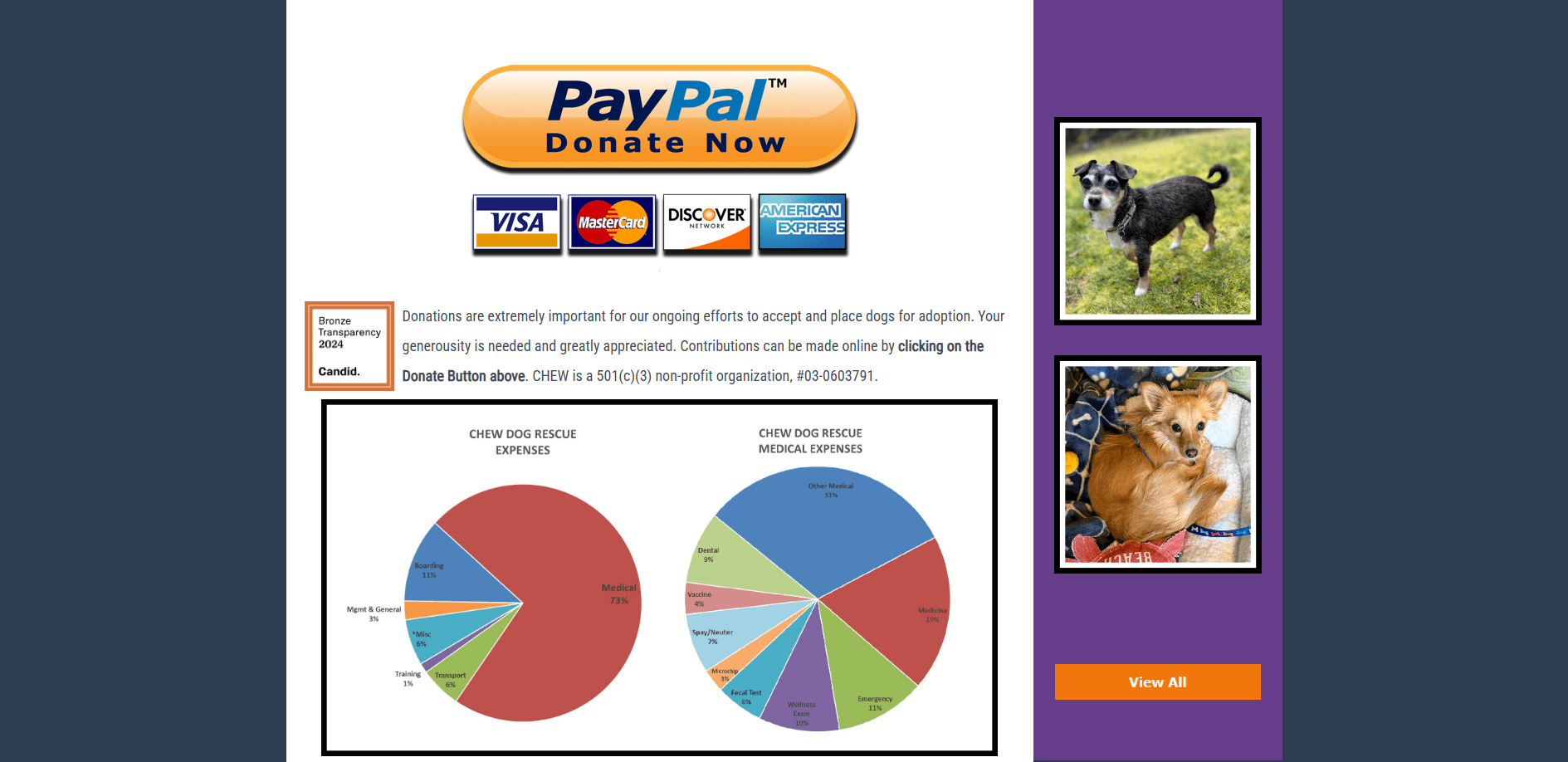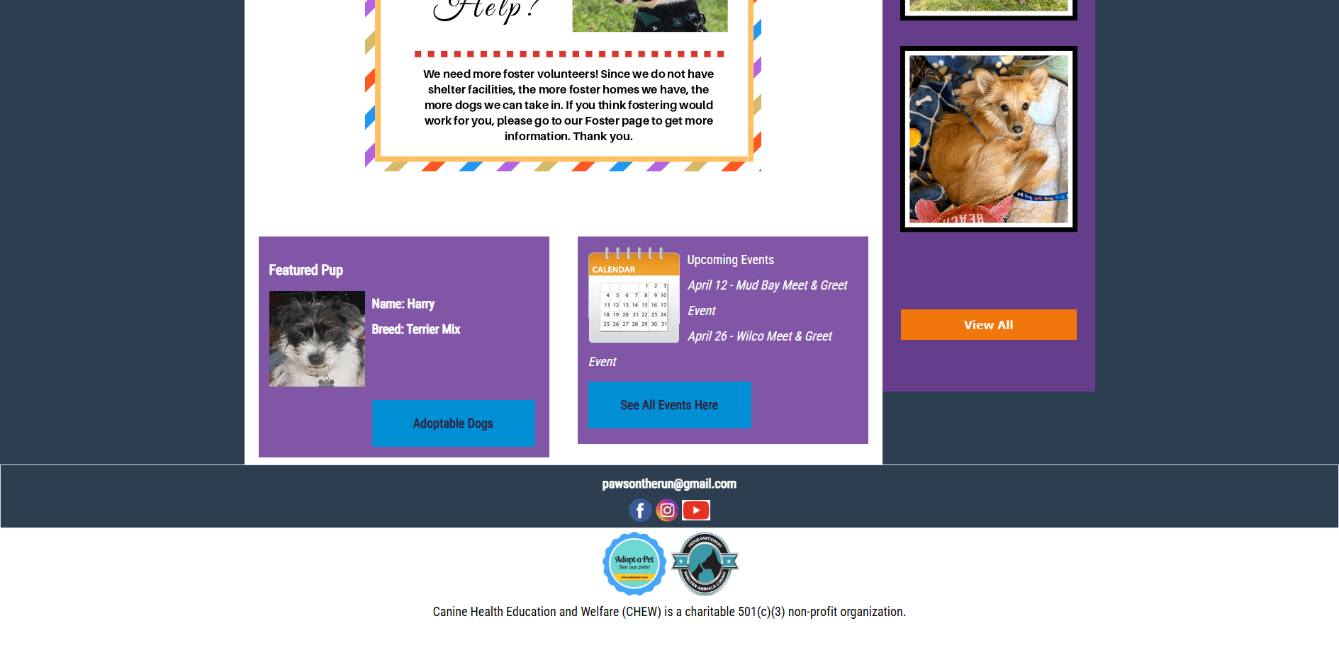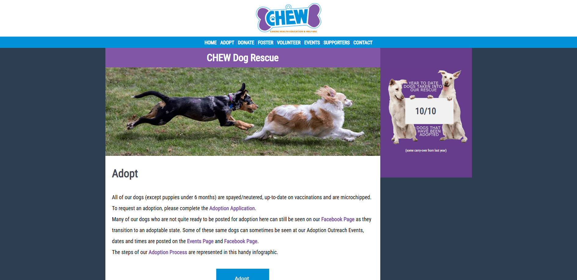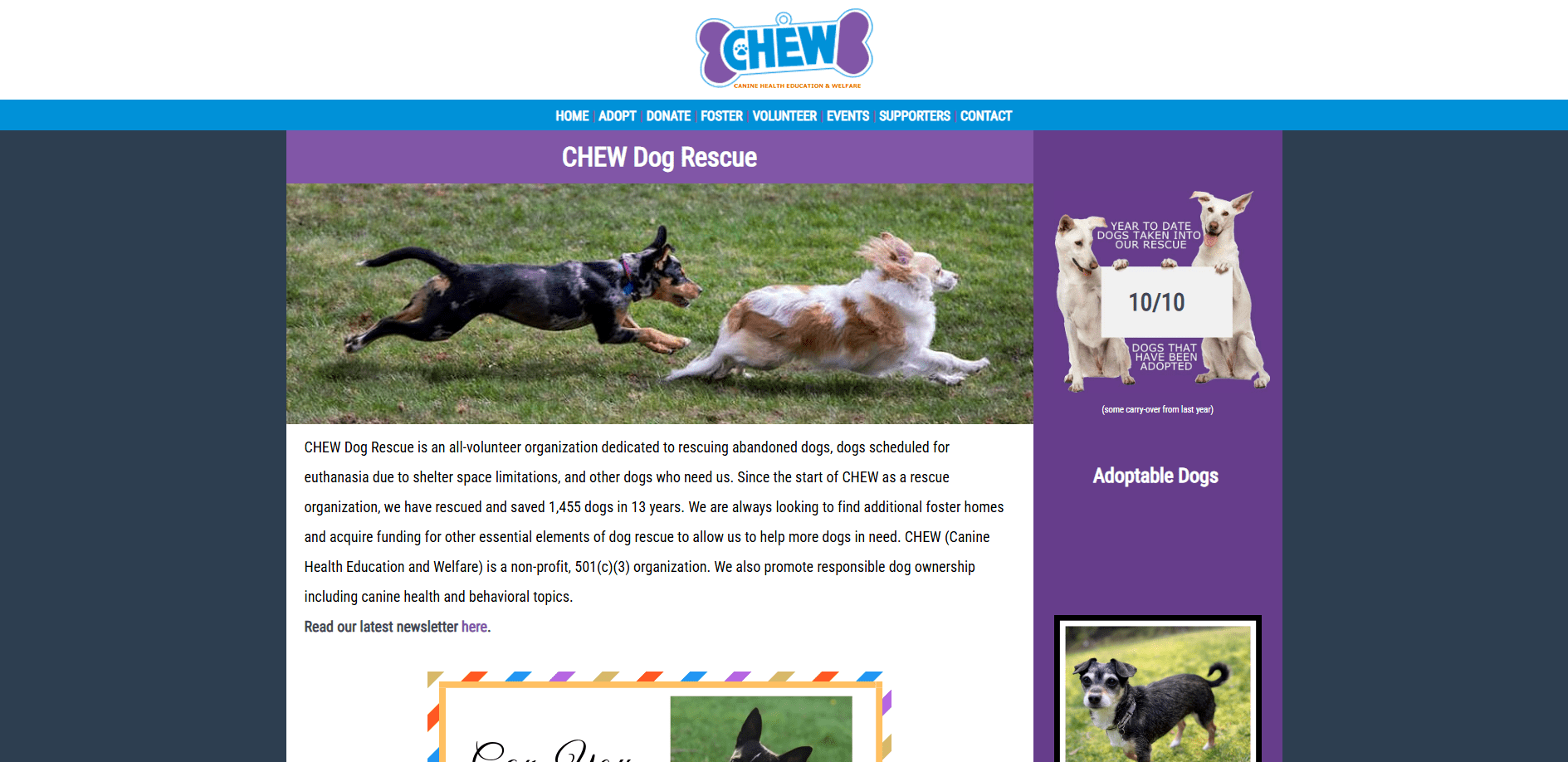 CHEW Dog Rescue is an all-volunteer organization dedicated to rescuing abandoned dogs, dogs scheduled for euthanasia due to shelter space limitations, and other dogs who need us. Since the start of CHEW as a rescue organization, we have rescued and saved 1,455 dogs in 13 years.